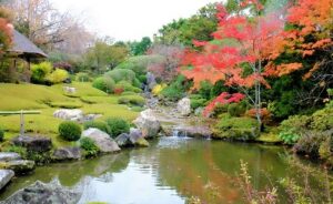静かな庭園で、紅葉と書院造りの建物が調和していて心が安らぎますよ。